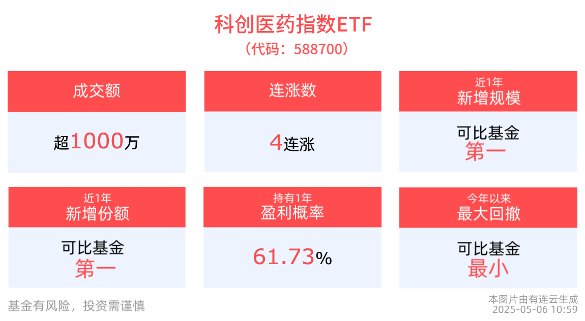 截至2025年5月6日 10:59,上证科创板生物医药指数上涨0.33%,成分股智翔金泰上涨4.71%,华恒生物上涨4.13%三羊财务,百利天恒上涨4.08%,南微医学上涨3.98%,澳华内镜上涨3.91%。科创医药指数ETF(588700)冲击4连涨。